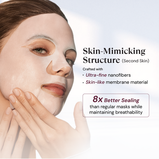 Crafted with ultra-fine nanofibers and superfine skin-friendly materials, this mask mimics the structure of human skin. Its smooth, delicate surface fits your face seamlessly from every angle (360°), flexing naturally like a second skin. After absorbing essence and moisture, the long fibers contract to tighten the skin and lock in moisture, ensuring full absorption without dripping. Offering 7 to 8 times better sealing than regular masks while maintaining breathability, it enhances layered essence penetration for a firm, deeply hydrated glow.